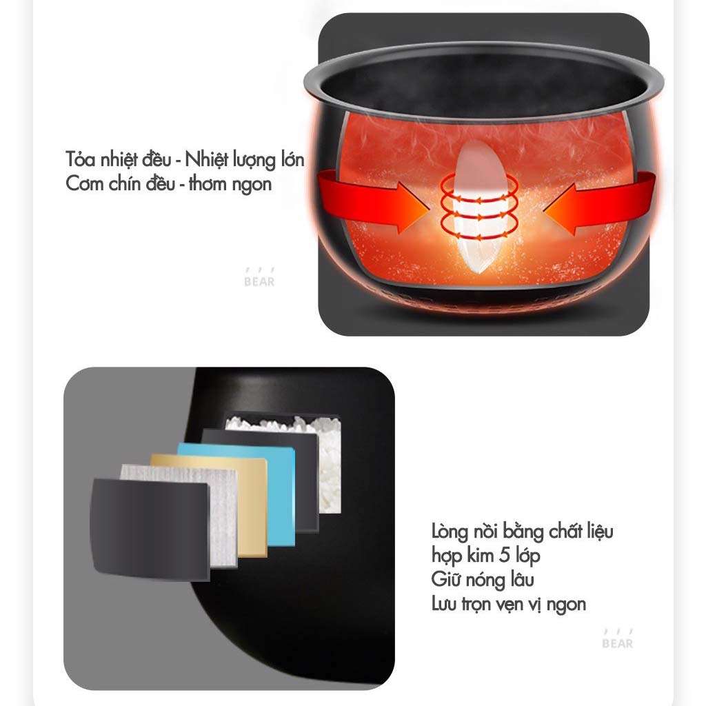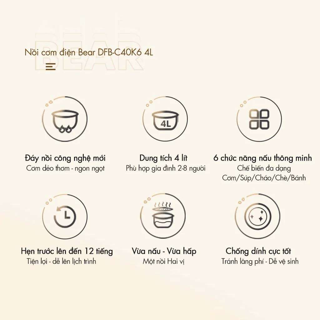 Nồi cơm điện Bear DFB-C40K6 là lựa chọn hàng đầu cho những gia đình từ 2-8 thành viên. Sản phẩm được nâng cấp với lòng nồi hợp kim 5 lớp kết hợp cùng công nghệ kiểm soát nhiệt tối ưu hoàn toàn mới tối ưu theo 7 giai đoạn nấu, cho cơm ngon và dẻo thơm như nấu bằng than củi.
